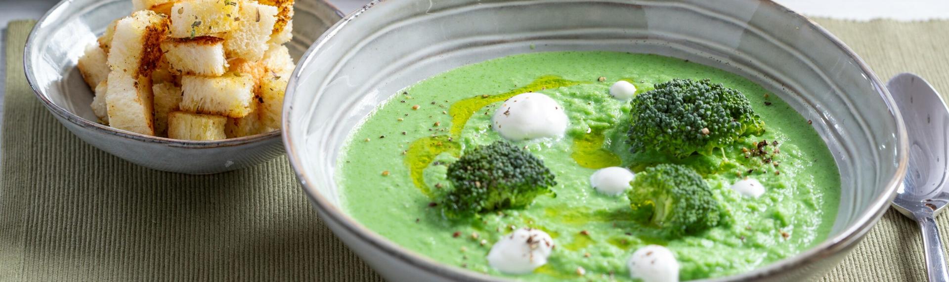Optionally decorate with a few florets of raw broccoli and small croutons golden in oil. Serve immediately topped with heavy cream and sprinkled with a round of pepper mill.