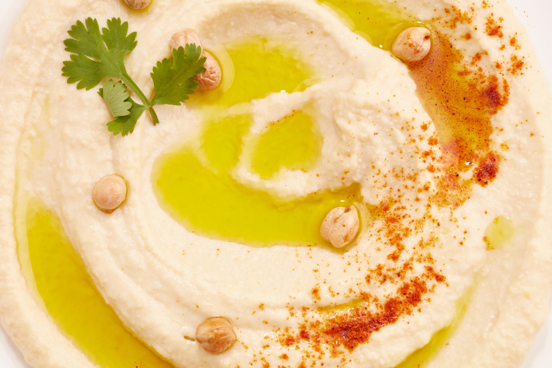 Place hummus in a serving container. Serve decorated with reserved chickpeas, cumin powder, drizzle of oil and coriander leaves.