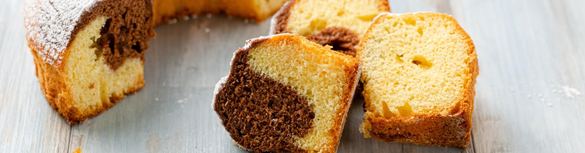 Butter a crown mold. Pour half of the plain dough, the chocolate dough, then the rest of the plain dough. Give a few fork strokes in the dough to make the marbling.