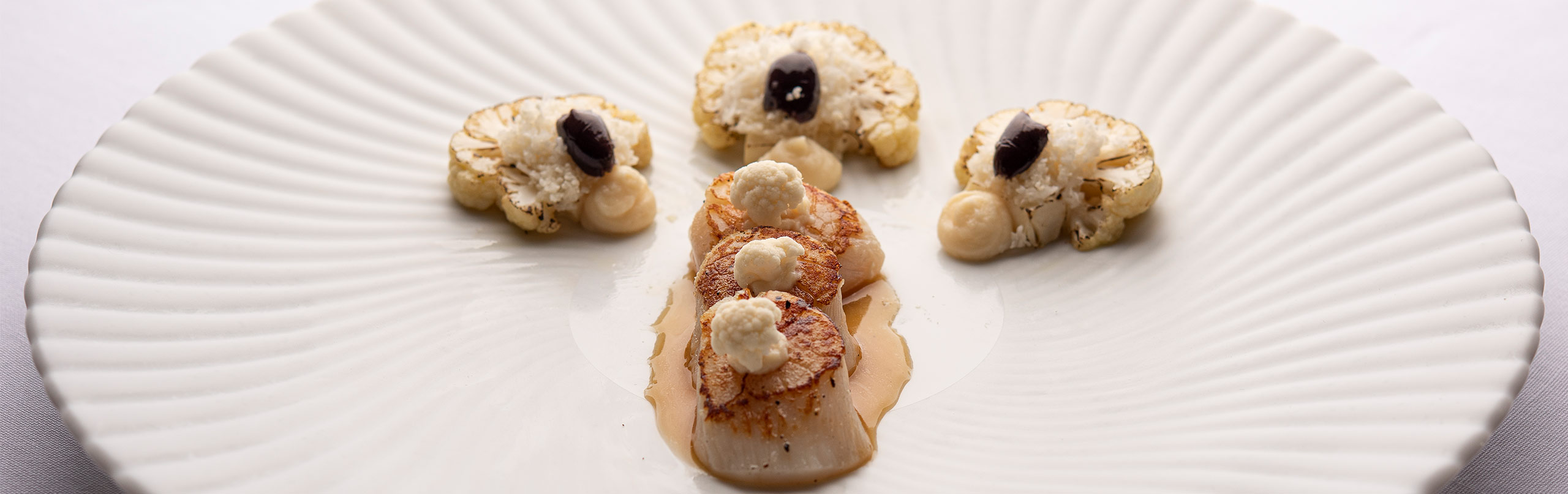 Arrange 3 scallops on a plate, one behind the other over a dollop of purée, with the 3 browned cauliflower florets fanned out. Place a small amount of cauliflower purée on the stem. Coat scallops with the onion jus.